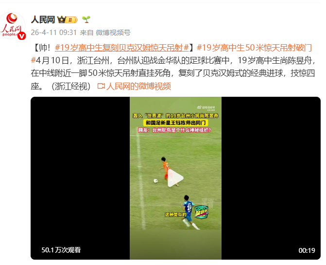 4月10日,浙江吴越杯台州VS金华,台州队77号球员一记50米半场吊射破门,让全国网友记住了这名19岁高中生尚陈昱舟。