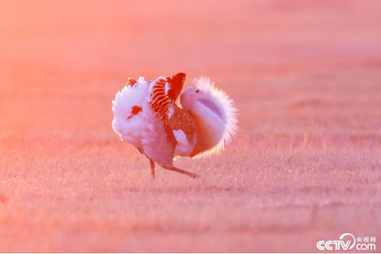 谷雨节气,黑龙江省大庆市红骥牧场草原上,国家一级保护动物大鸨迎来繁殖季,晚霞中雄鸟翻花炫耀吸引异性。