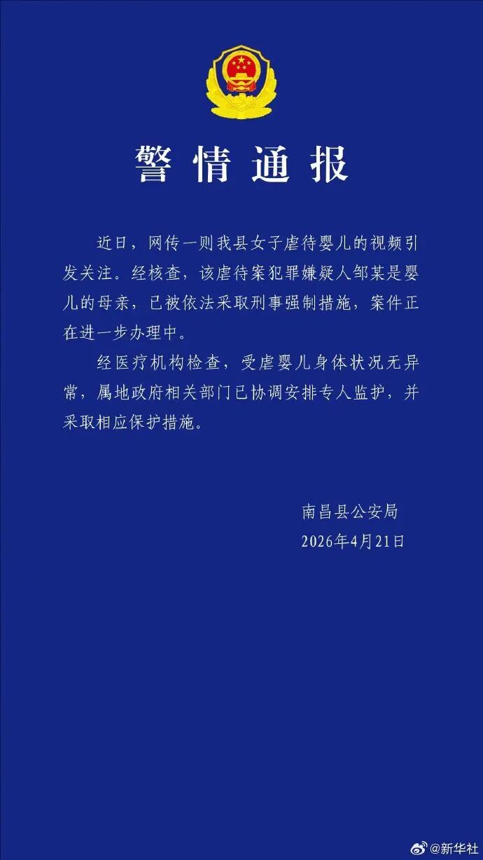 4月20日,多位江西网友反映,当地一母亲疑似虐打幼婴。网友提供的三段事发视频显示,一名不满周岁的婴儿被其母亲拉拽、扇巴掌。据网友称,事发地为南昌县东新街道某小区,已有爱心人士报警。4月21日晚,南昌县公安局发布通报:该虐待案犯罪嫌疑人邹某是婴儿的母亲,已被依法采取刑事强制措施。
