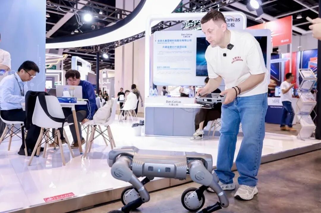 Sandra女士来自德国法兰克福的一个工业园区的运营企业,她看中了伽利略机器狗的安防巡检功能,想引进一批以节约人力。“我们这款机器狗有双激光雷达+前视广角相机,12个高扭矩关节模组,有超强的地形适应力,还有IP67级防护,能应对各种复杂环境……”陈鹏自信地介绍着,Sandra女士微笑着频频点头。