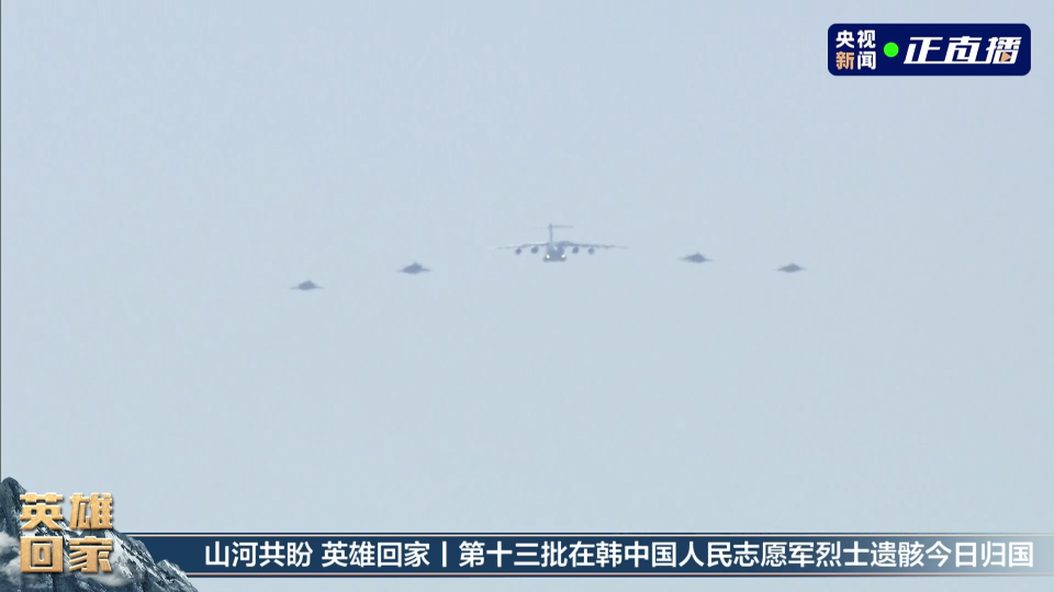今天上午,赴韩接迎第十三批在韩志愿军烈士遗骸的运-20B专机飞抵沈阳桃仙国际机场上空,4架歼-20战机护航伴飞。5机组成“箭”形编队列阵长空,以最高礼仪告慰先烈。
