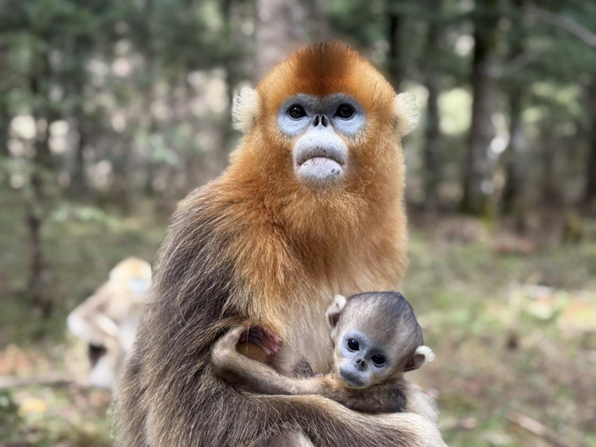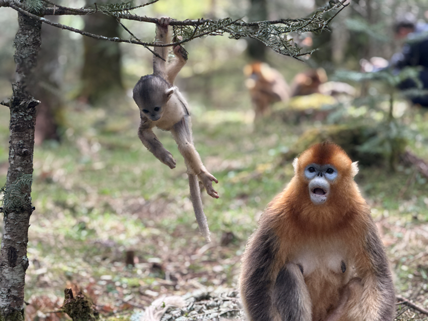 在大龙潭金丝猴野外保护研究基地的密林间,一只新生的小金丝猴紧紧依偎在母亲怀里,好奇地打量着四周的冷杉。这只被科研人员唤作“芙圆”的幼年金丝猴,出生在今年的世界野生动植物日,也就是元宵节当天。自3月以来,这片海拔最高处达3106.2米的高寒林区接连迎来了7个猴崽。