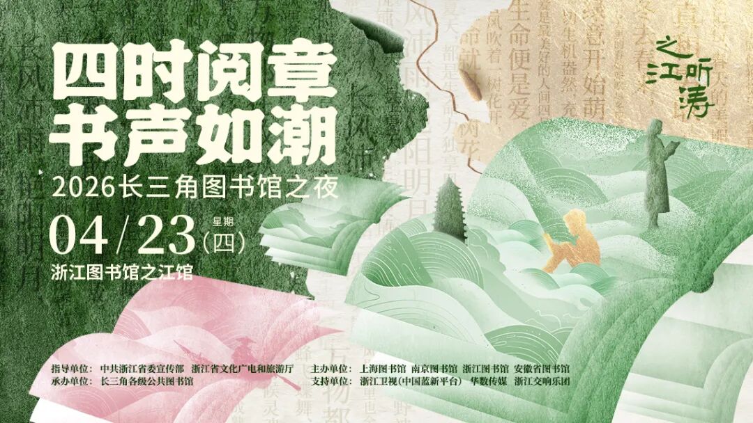 2026年4月23日,浙江图书馆之江馆,“四时阅章 书声如潮——2026长三角图书馆之夜”主题活动即将拉开帷幕!这是上海、南京、浙江、安徽及长三角各级公共图书馆,携手多年打造的文化品牌。