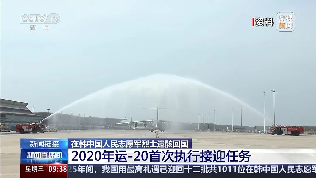 今天,接迎第十三批在韩志愿军烈士遗骸的运-20B专机飞抵沈阳桃仙国际机场。专机降落后,机场以“过水门”最高礼遇迎接英雄回家。