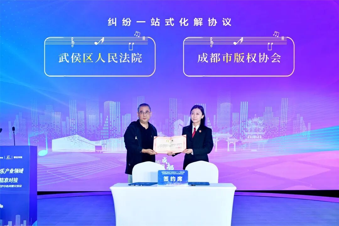 法治护航也是此次活动的一大亮点。当天,武侯人民法院与成都市版权协会签署纠纷一站式化解协议,武侯区法院、武侯区市场监管局、成都音乐文创园管委会、成都市版权协会联合发布音乐知识产权保护举措,构建“事前风险防控+事中纠纷化解+事后司法救济”全链条保护体系。