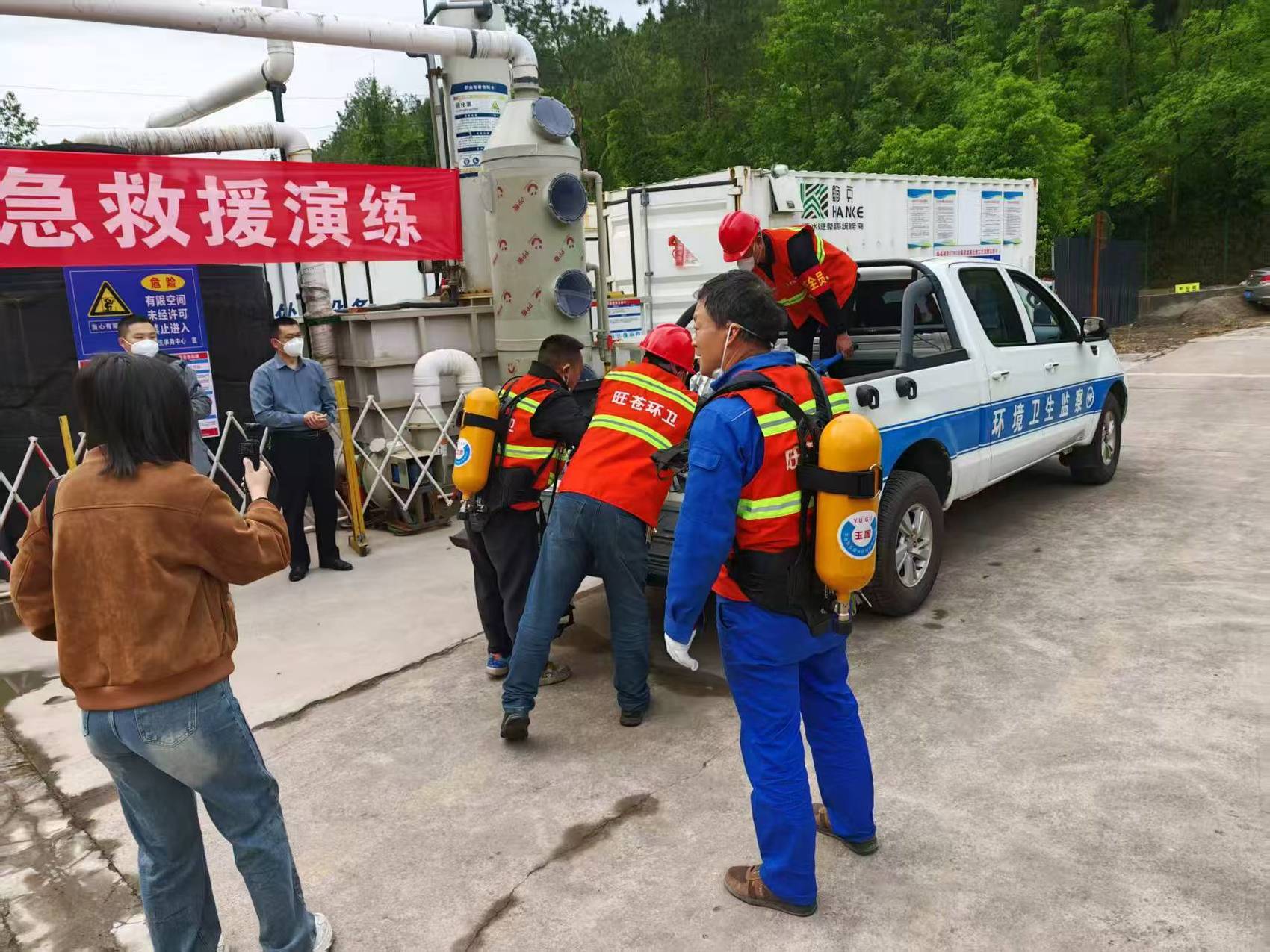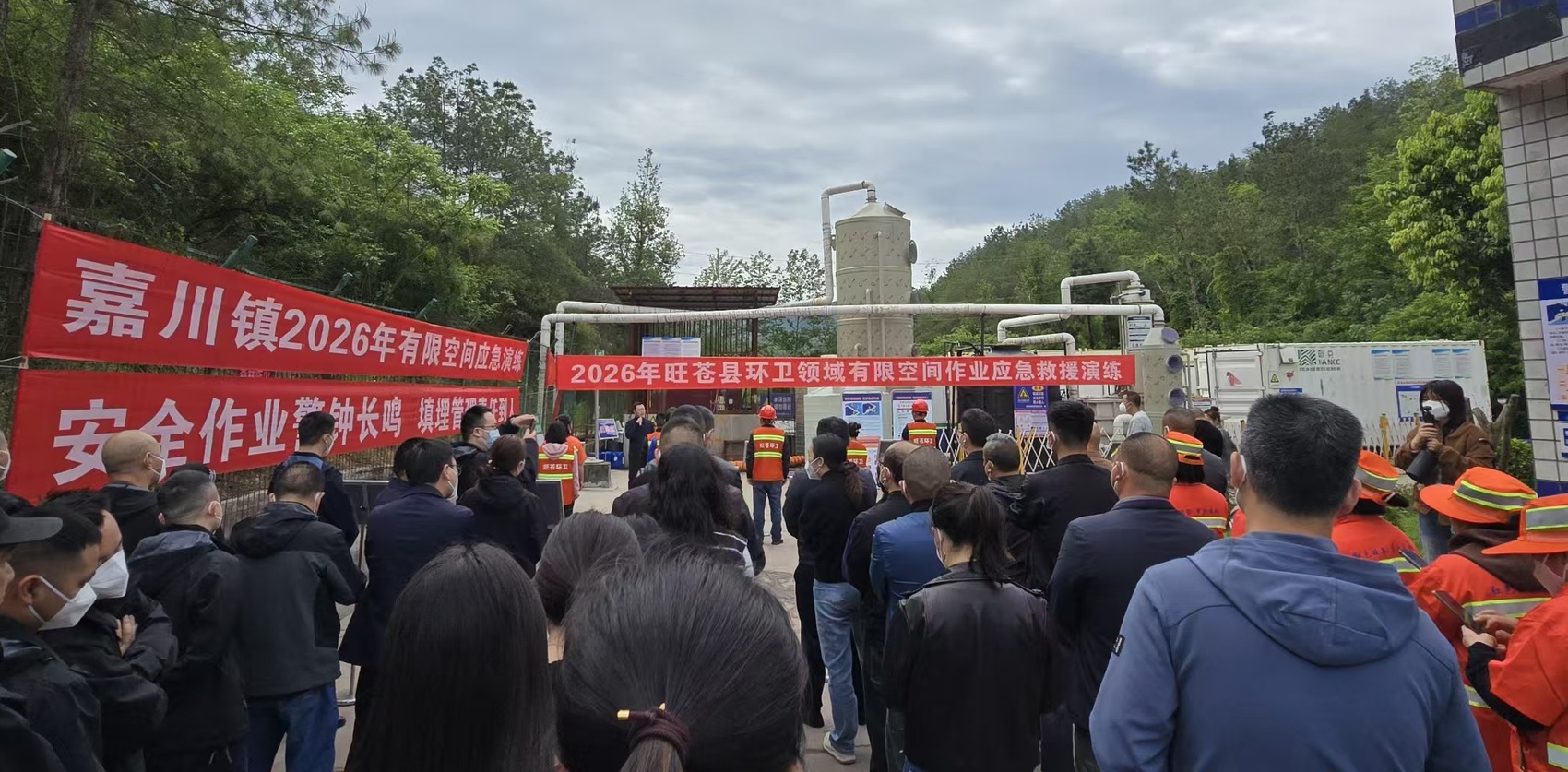 4月22日,广元市旺苍县模拟在真实场景的有限空间中毒窒息应急救援演练。演练紧扣环卫有限空间作业高温、缺氧、有毒有害气体易积聚的风险特点,以MBR膜池(一种污水处理专用反应池)清洗作业突发停电为模拟场景,完整还原作业人员中毒窒息、应急救援、现场处置全流程。