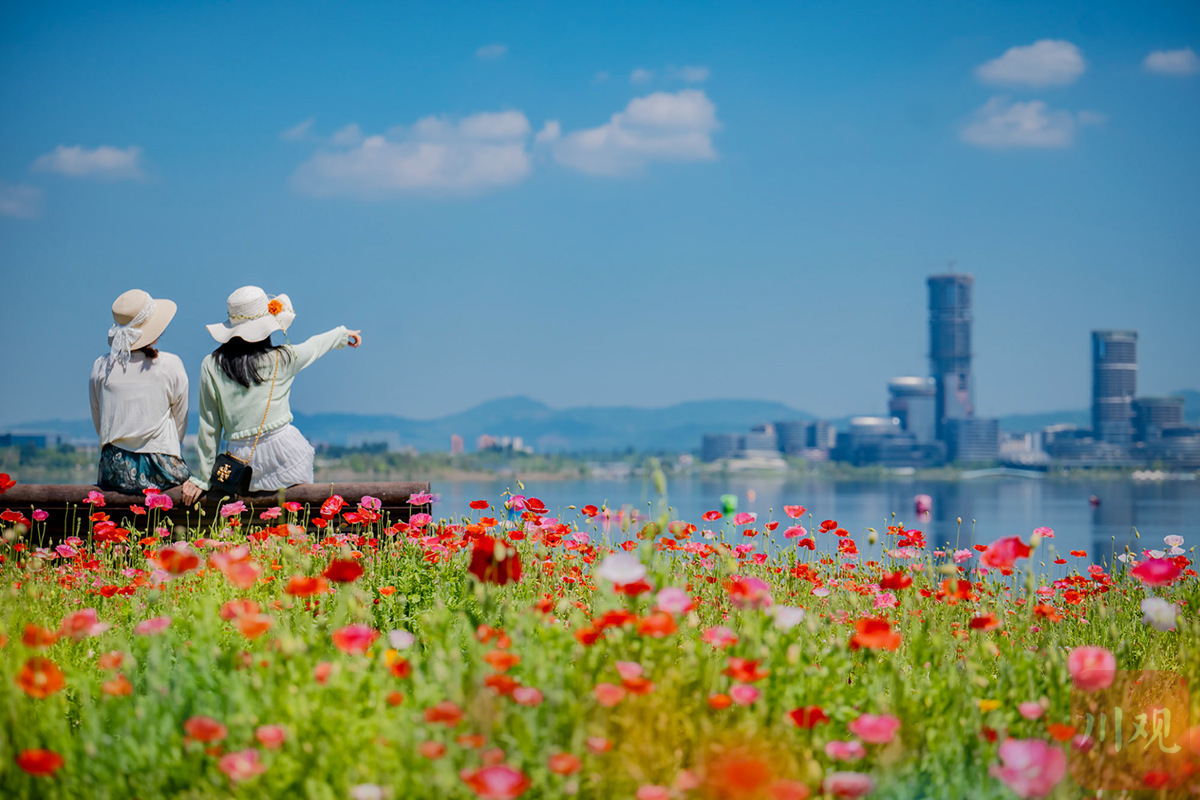 4月17日,宜宾市翠屏区安阜街道岷江花海的各类花卉盛开,吸引众多市民、游客前来打卡留影。C视觉摄影师 王宇 摄