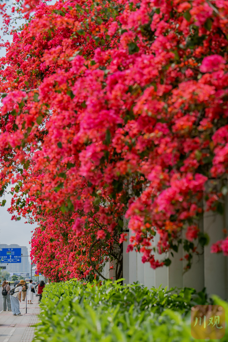 4月16日,成都石室天府中学(交子校区)围墙处成片三角梅紫红花枝如绚烂花瀑倾泻而下,成为蓉城春日靓丽风景线。C视觉摄影师 周巧旻 摄