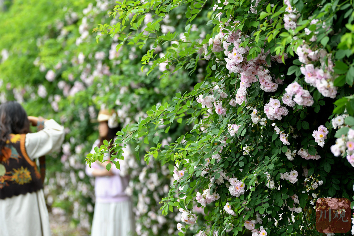 4月15日,绵阳经开区红桥路与红塔街十字路口,蔷薇花散发着浓郁芳香,引得游人驻足拍摄。C视觉摄影师 王勇 摄