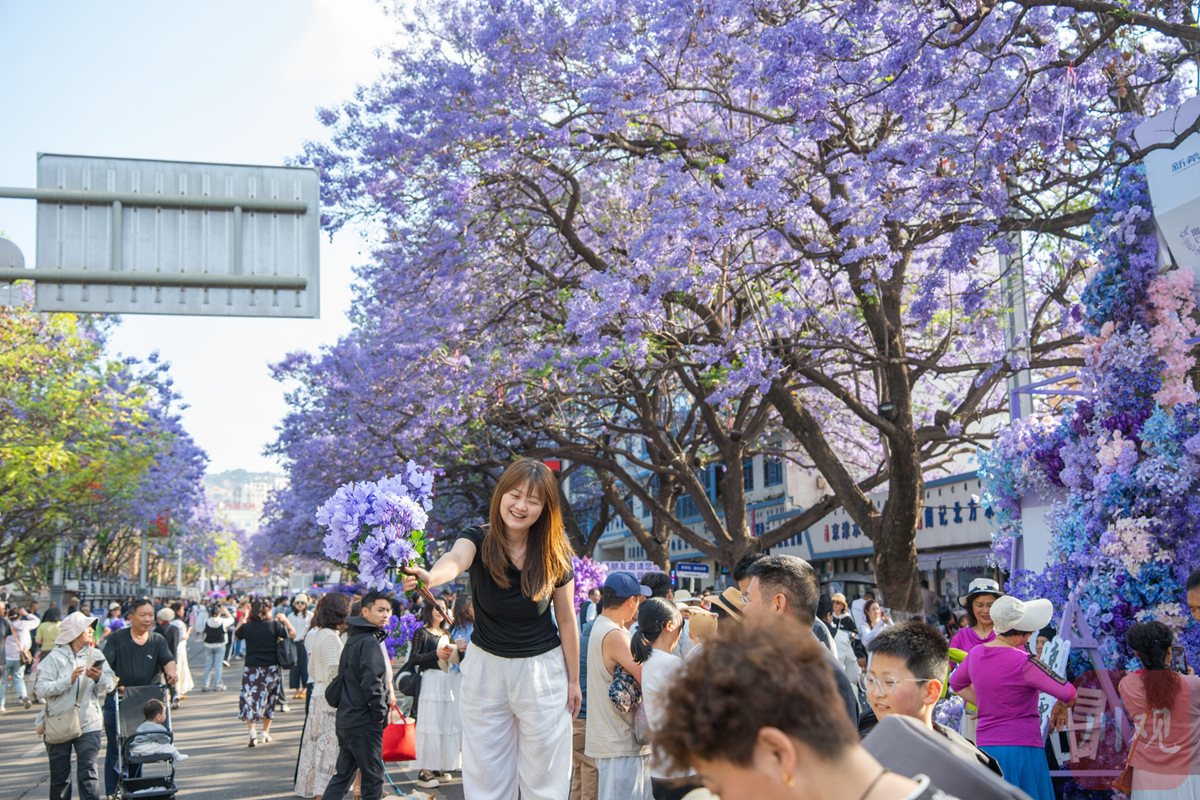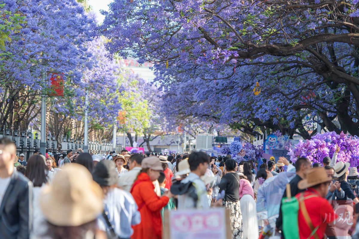 4月18日,西昌蓝花楹盛放,蓝紫色花海覆盖街头,众多市民、游客前来打卡留影。C视觉摄影师 施少府 摄