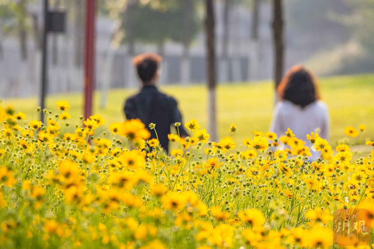 4月19日早晨,眉山东坡城市湿地公园,成片的大花金鸡菊迎着晨光熠熠生辉,人与花海相映成趣。C视觉摄影师 李继军 摄