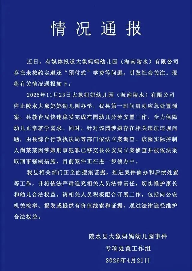 海南陵水县大象妈妈幼儿园事件专项处置工作组发布情况通报: