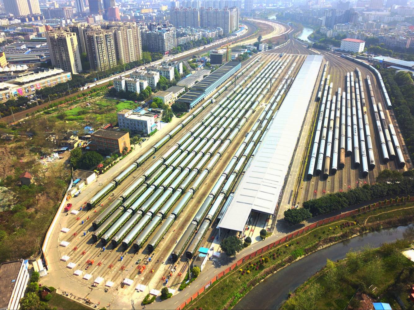 成都车辆段成都客技站是目前西南地区铁路客车车辆整备能力最强的场站,建有21条运用整备线,每天可以办理28列约合500节客车车厢的运用检修作业。