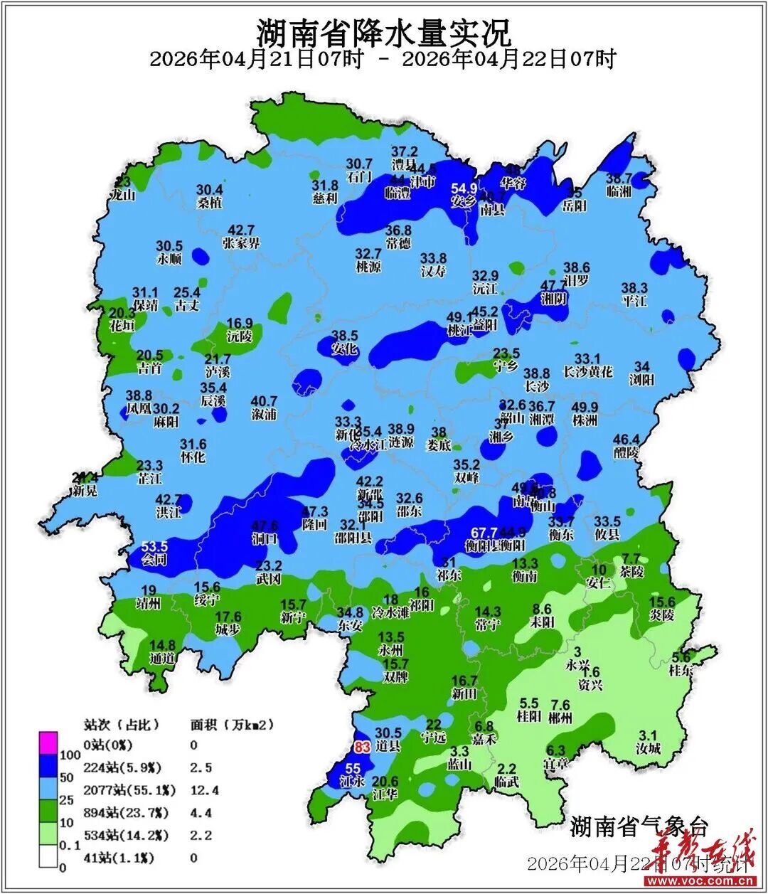 (4月21日7时-4月22日7时,全省降水量情况。 图/湖南省气象局)