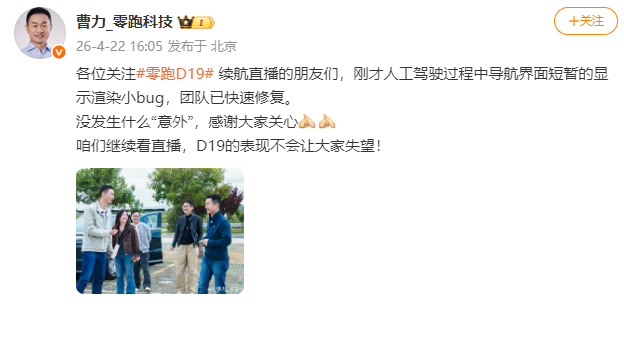 据此前报道,4月22日,零跑汽车开启D19车型“杭州至北京千里续航不间断实测挑战”直播,直播画面显示,当时车辆正在高速路段行驶,中控屏上仅显示车辆模型,车道线、其他车辆等关键信息全部消失。在导航界面bug出现后,零跑汽车直播间直接关闭了评论区,用户无法发送评论互动。直播画面中,零跑汽车高级副总裁曹力也频频看向中控屏,神情略显紧张。
