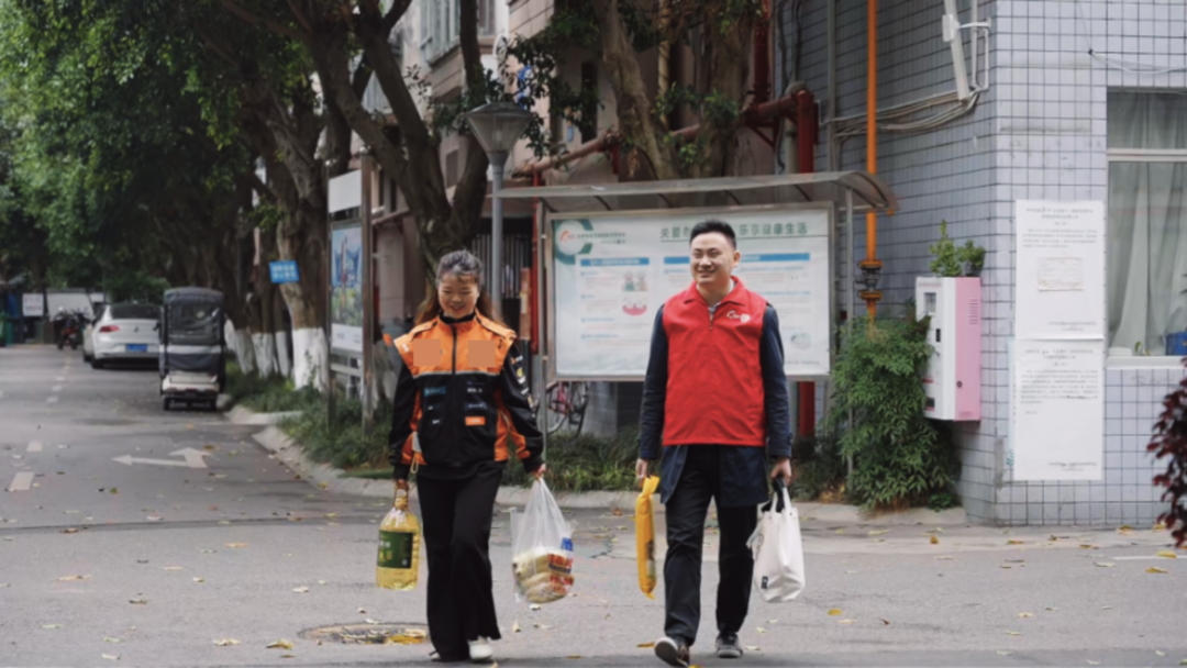 送完东西,田红锦拐进朝阳社区爱新“巴适”。给手机充上电,坐下来匆匆吃完早饭。这会儿,她之前约的好友——社区志愿者提着一大袋水果到了,两人随着社区工作人员,带上之前在驿站准备好的一袋米、一桶油,来到了一位七旬独居老人的家中。老人儿子几年前去世,孙女在读高中,平时住校。