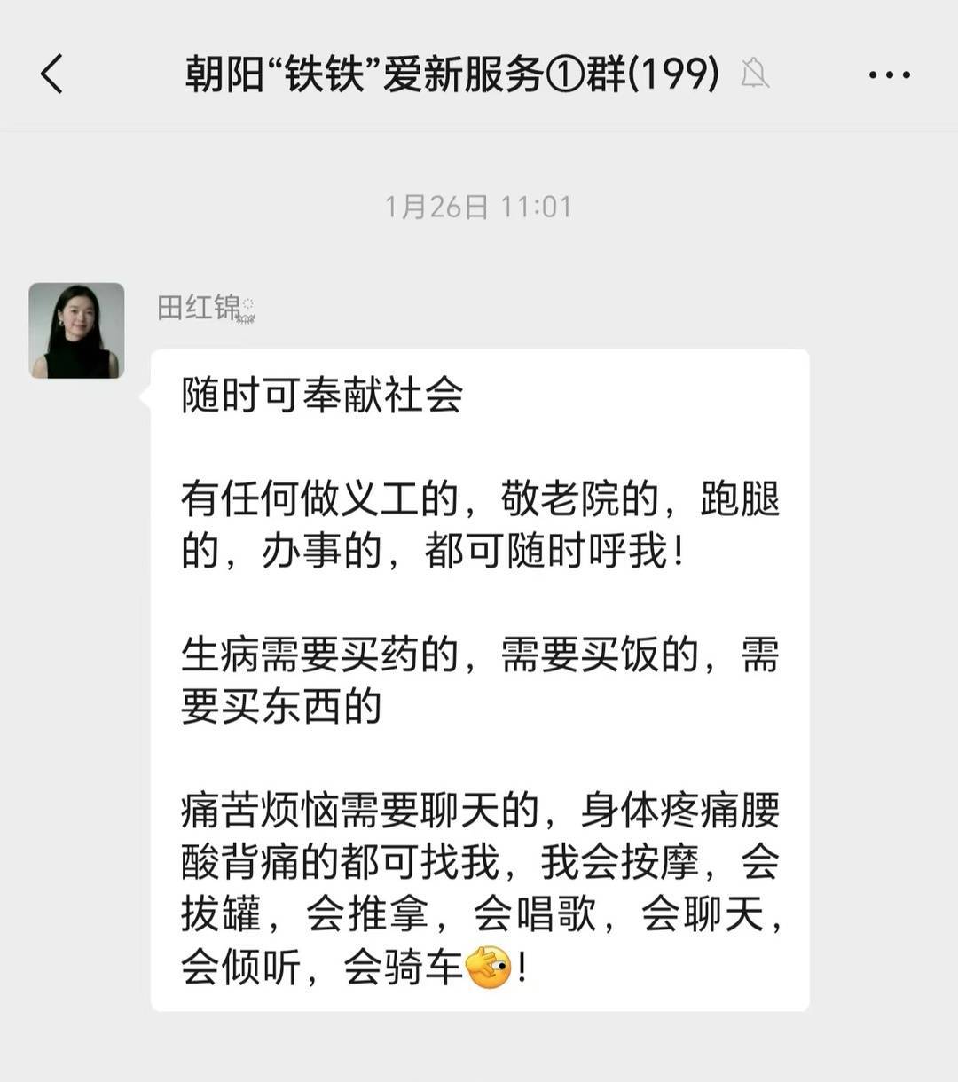 很久以前,她就在朝阳“铁铁”爱新服务群里发过一段话:随时可奉献社会。有任何做义工的,去敬老院的,跑腿的,办事的,都可随时呼我!生病需要买药的、买饭的、买东西的,痛苦烦恼需要聊天的,身体疼痛腰酸背痛的都可找我,我会按摩、拔罐、推拿,可以唱歌、聊天、倾听,还会骑车。