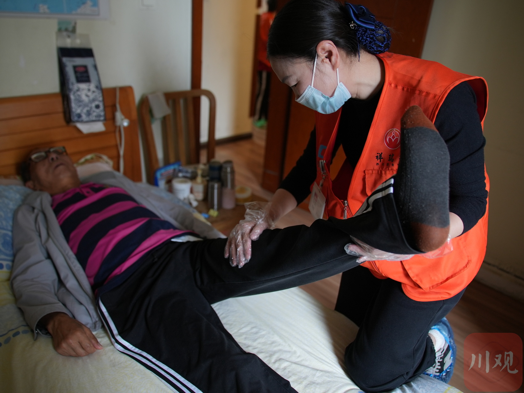 “罗哥,昨晚休息得好不好啊?我们今天主要做基础功能护理。”4月22日上午,成都成华祥瑞通护理站的养老护理员龚春容背着大大的护理包,熟门熟路地敲开74岁大爷罗先泽的家门。