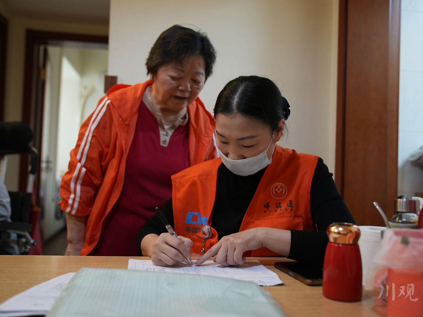 护理员龚春容填写当天的护理服务确认单