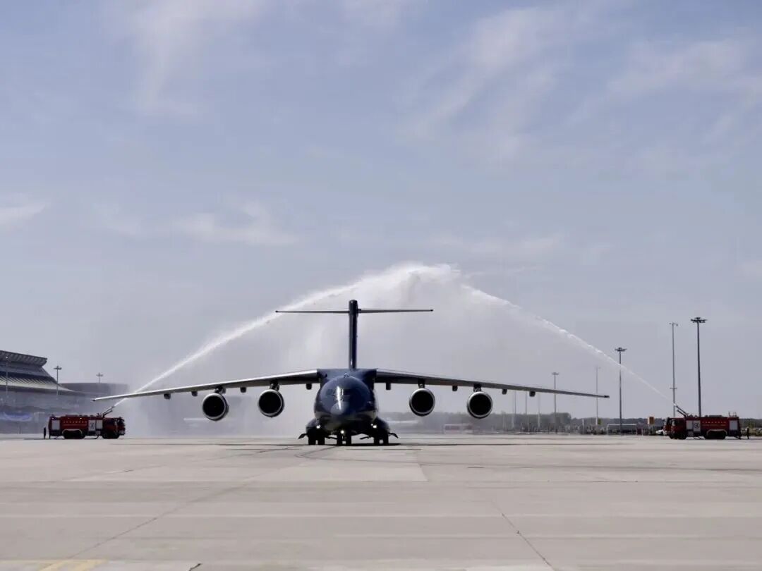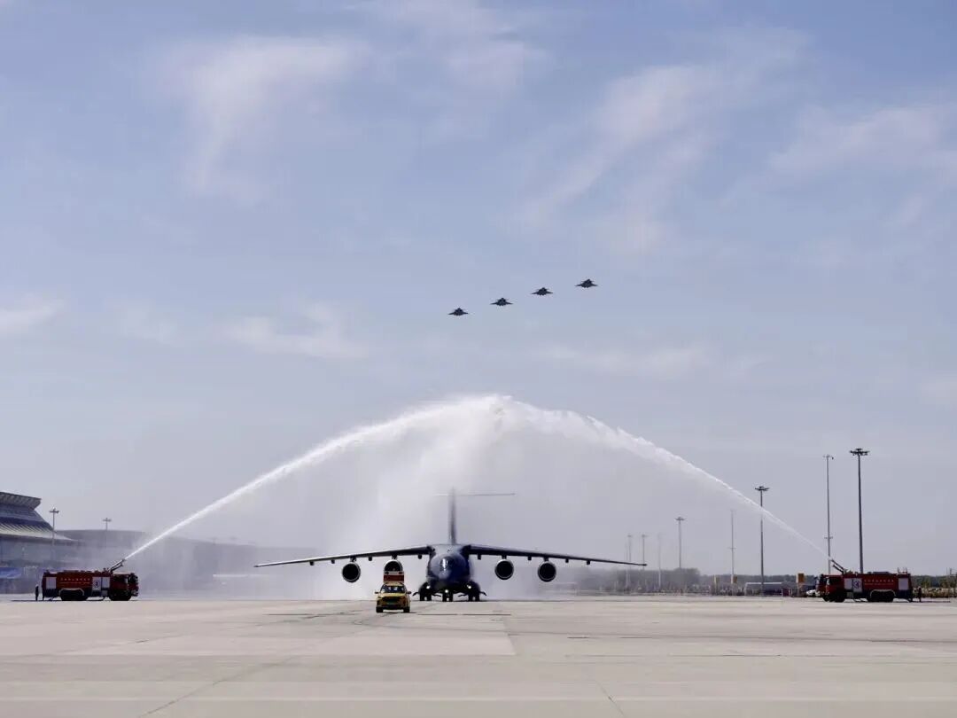 专机降落后机场以“过水门”最高礼遇