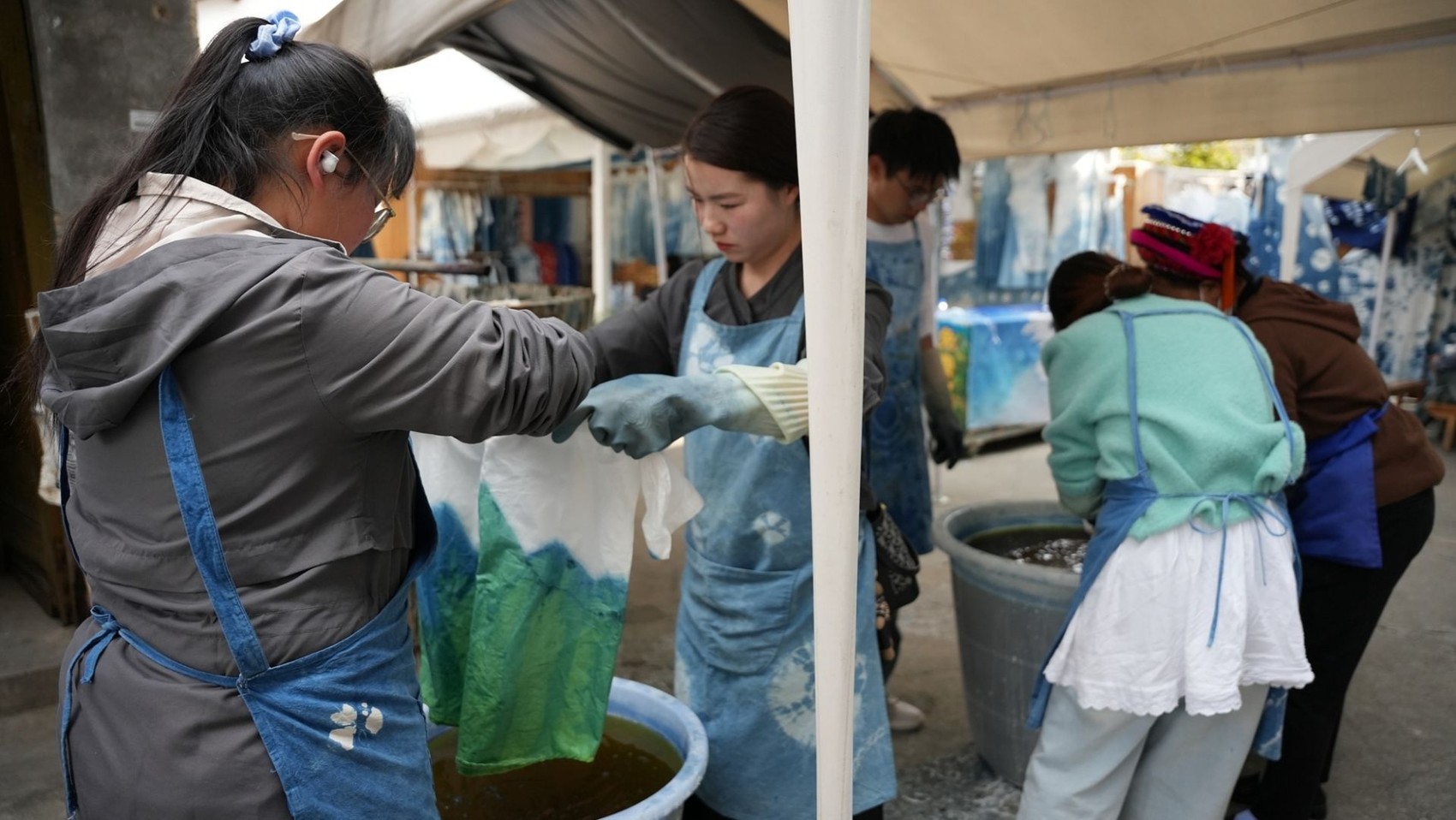 云南大理:游客体验白族扎染技艺