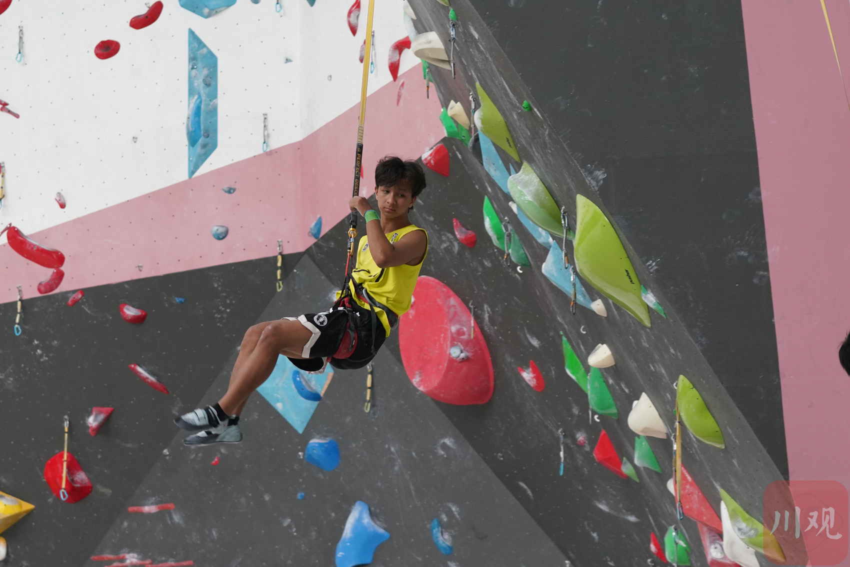 在眉山国际攀岩中心,四川省和眉山市共建的攀岩队正在室内速度岩壁上训练,哨声响起,几秒钟,运动员们就从底部攀到了岩顶,教练熬宽说:“场馆不仅大,岩点和线路风格丰富,对于难度和攀石项目的选手来说,他们可以在这里感受多元化的攀爬和挑战。”