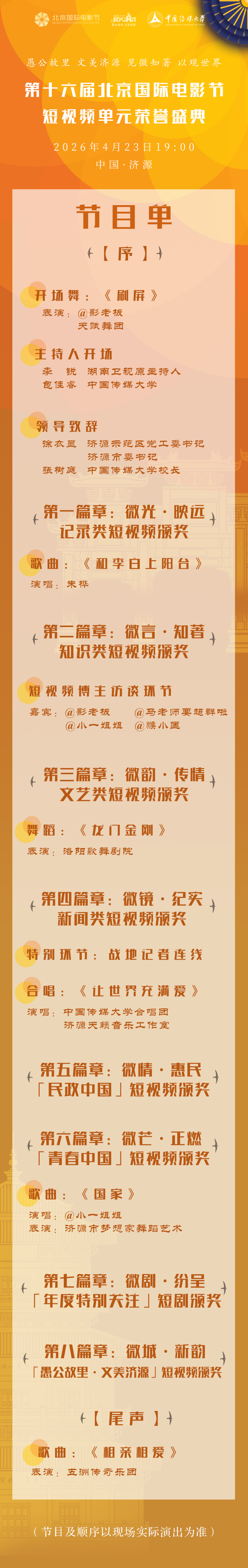 本届荣誉盛典为短视频单元首次走出北京、落地愚公故里济源,在山水之间书写“见微知著、以观世界”的崭新篇章。现场将揭晓各大类别荣誉作品,并同步启动济源微短剧基金与 “文美济源” 主题赛道。盛典现场群星荟萃,黄奕、黄小蕾、李东学、张光北、张歌、龚锐、朱桦等知名演员与歌手,以及@影老板、@马老师要超群啦、@小一姐姐、@猴小匡等嘉宾将共同出席。在表演环节,这场打破次元的光影盛宴,不但会让龙门金刚在愚公剧场重现经典,更将引领观众感悟移山精神,与《让世界充满爱》隔空共振,《和李白上阳台》《国家》《相亲相爱》等歌舞将青春脉动与千年古韵完美融合。更多精彩环节,敬请期待!