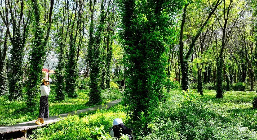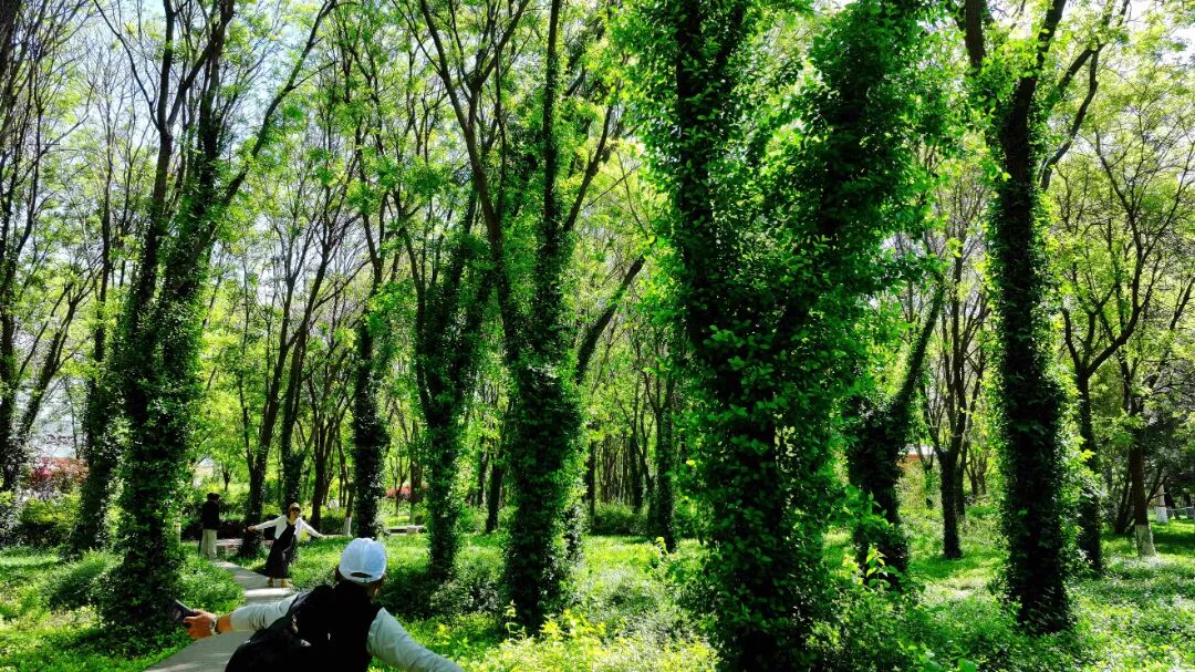 这片独特景致,是该公园破解林下斑秃难题的创新实践。针对林下高荫蔽导致的草坪退化问题,公园选用耐阴耐旱的小叶扶芳藤,通过“地被密植+树干引导”的方式,既让藤蔓覆盖裸露地表形成绿毯,又引导其沿树干向上攀爬,打造出层次丰富的立体绿化景观。经多年精细化养护,这种藤蔓植物已完全适应环境,4月下旬叶片繁茂浓密,阳光穿透枝叶洒落细碎光斑,随手一拍皆是自然诗意。