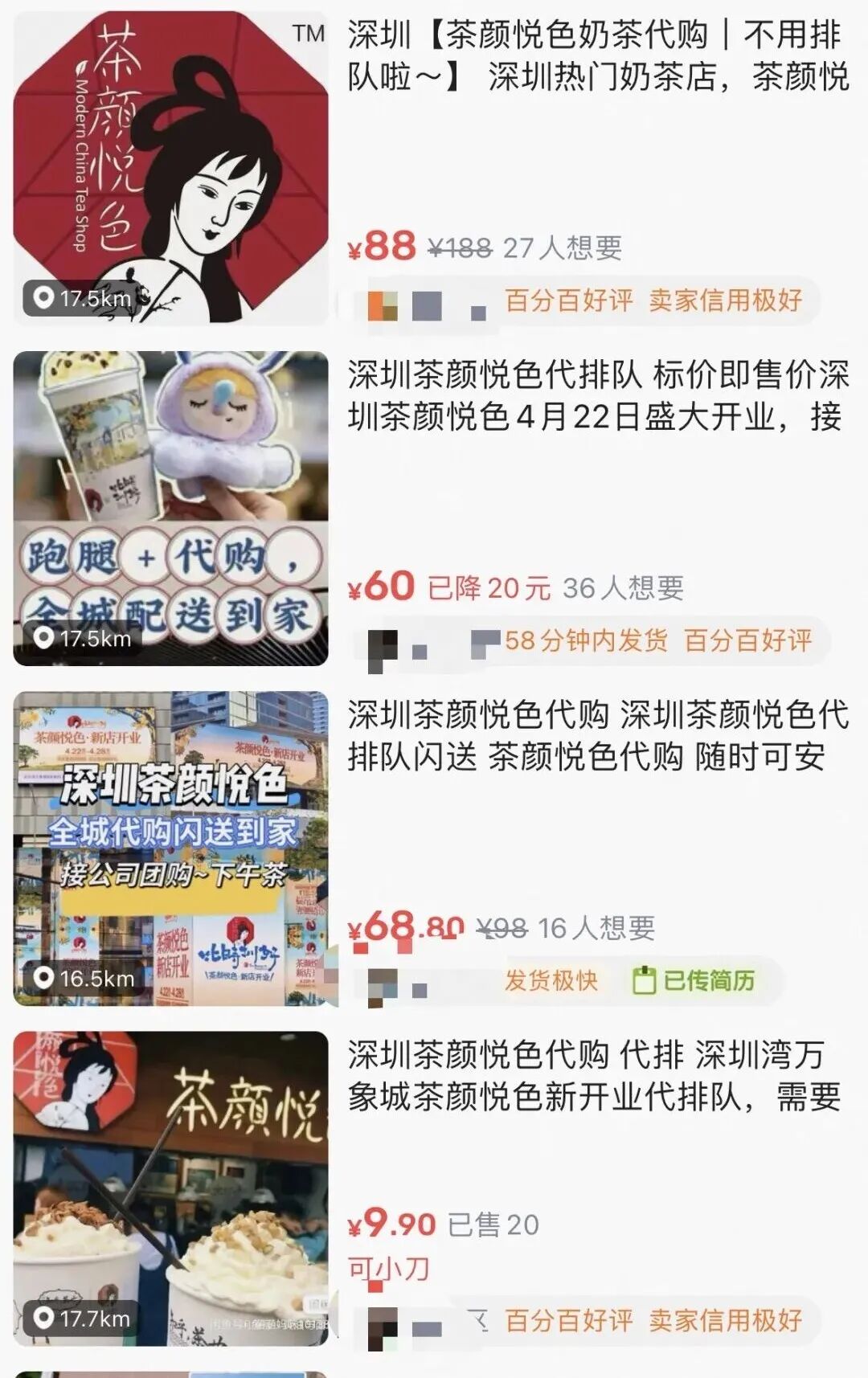 据悉,早在4月21日茶颜悦色官方预告开业后,社交平台上就已出现大量“代购、代跑腿”的相关内容。除了当地市民个人自发代购外,有招人排队的帖子流出,称已有超百名专业黄牛提前在深圳集结,且黄牛团队已招满,不再接纳新的人员加入。
