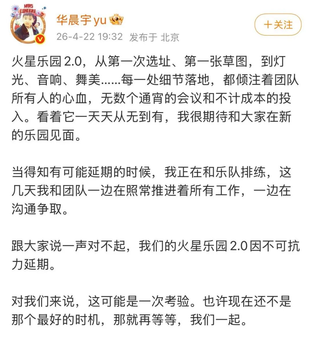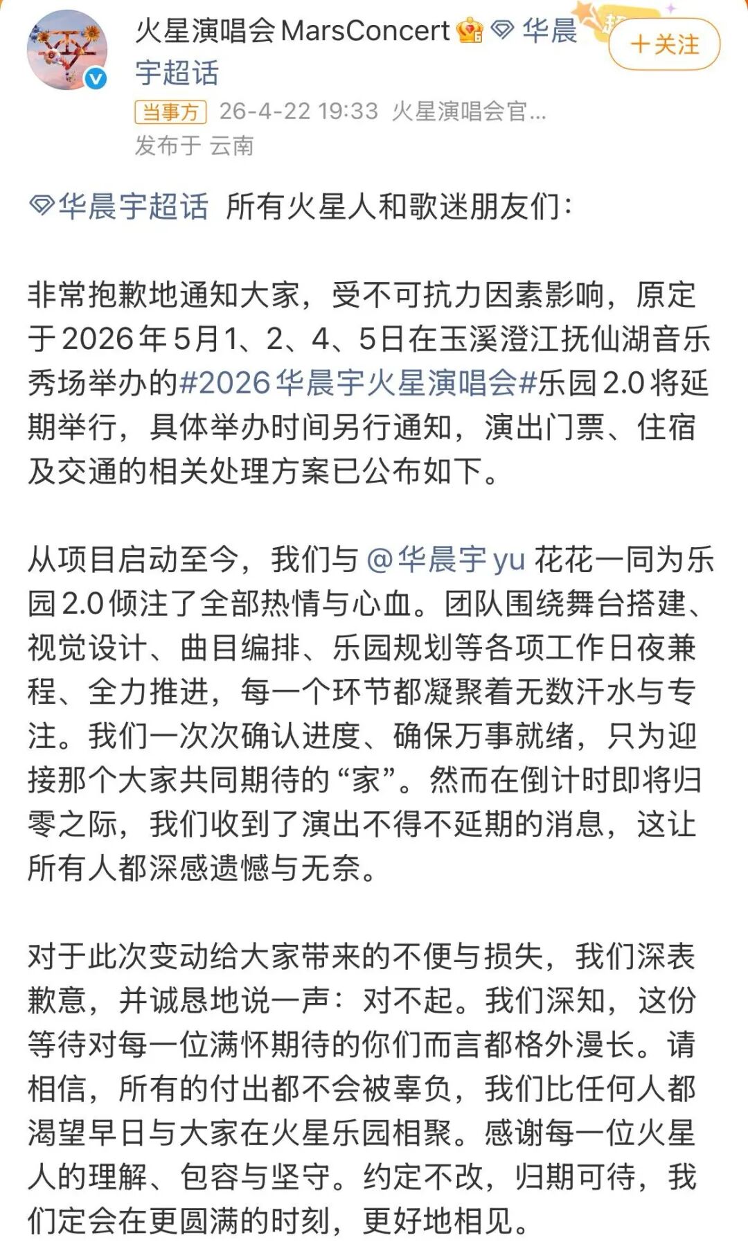 歌手华晨宇发文致歉