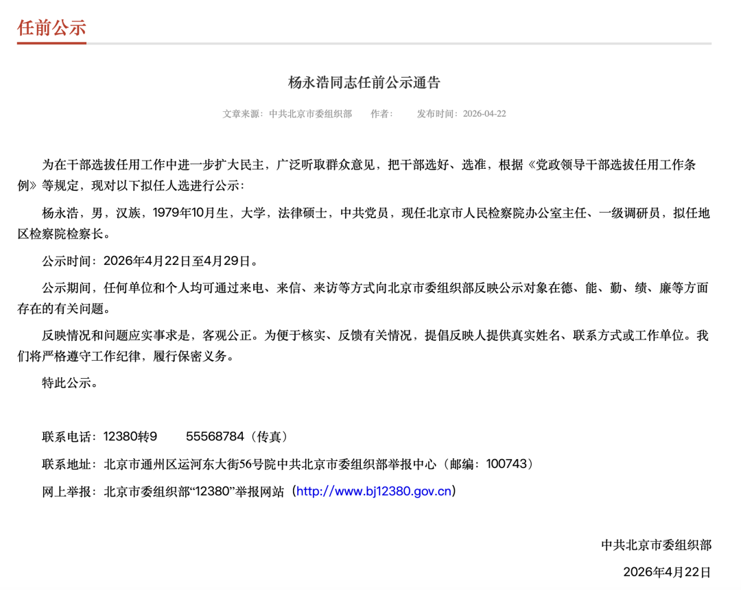 4月22日,北京组工网发布《杨永浩同志任前公示通告》。