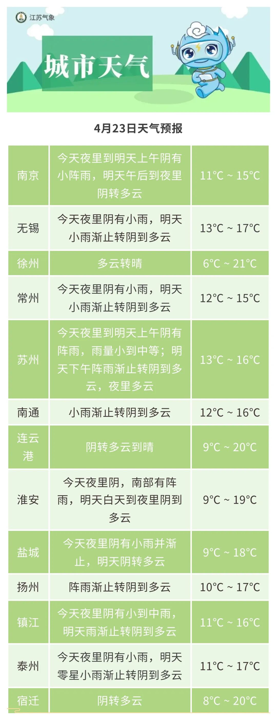 23日除了淮安、连云港能达到20℃