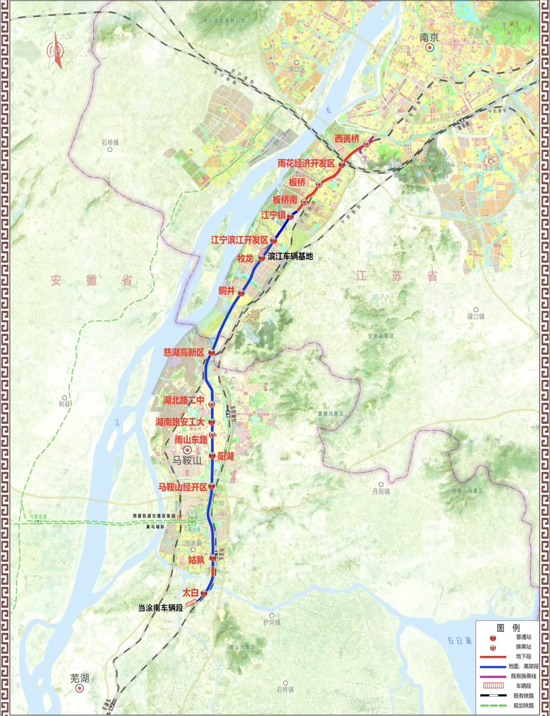 该线路起自南京市西善桥站,终至马鞍山市太白站,途经南京市板桥新城、滨江新城,马鞍山市花山区、雨山区、当涂县,全长约54.23公里,设站16座(南京段8站、马鞍山段8站)。车辆采用市域B型车,设计最高运行速度120公里/小时。
