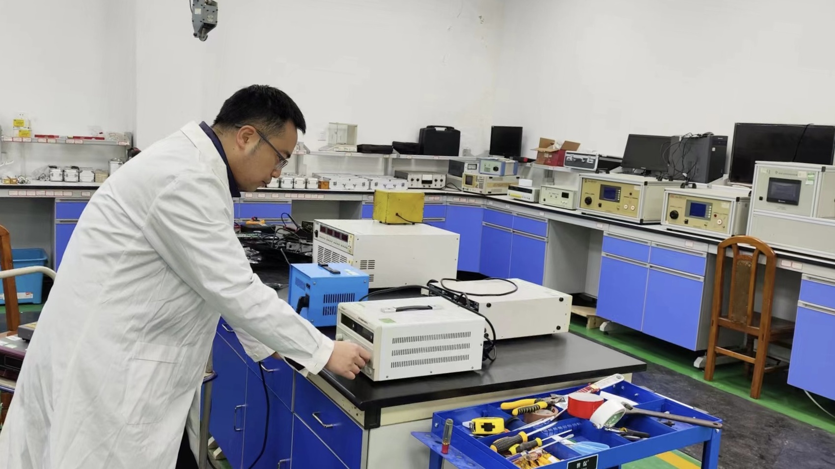 四川省电子产品监督检验所的检验检测实验室内,工作人员正在对电子产品进行检测。受访者供图