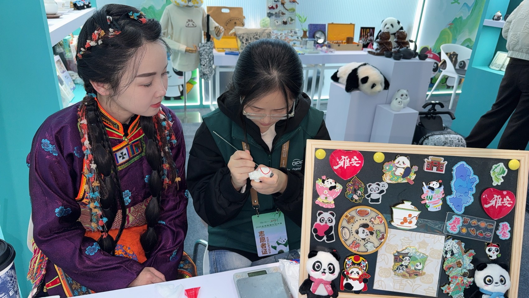 2024年夏天,一名全国连锁酒店负责人来到工作室,原本只是随便看看,结果一待就是两小时,当场敲定定制订单。“他看中我们把雅安茶文化和熊猫结合在一起的设计,说这才是有故事的伴手礼。”