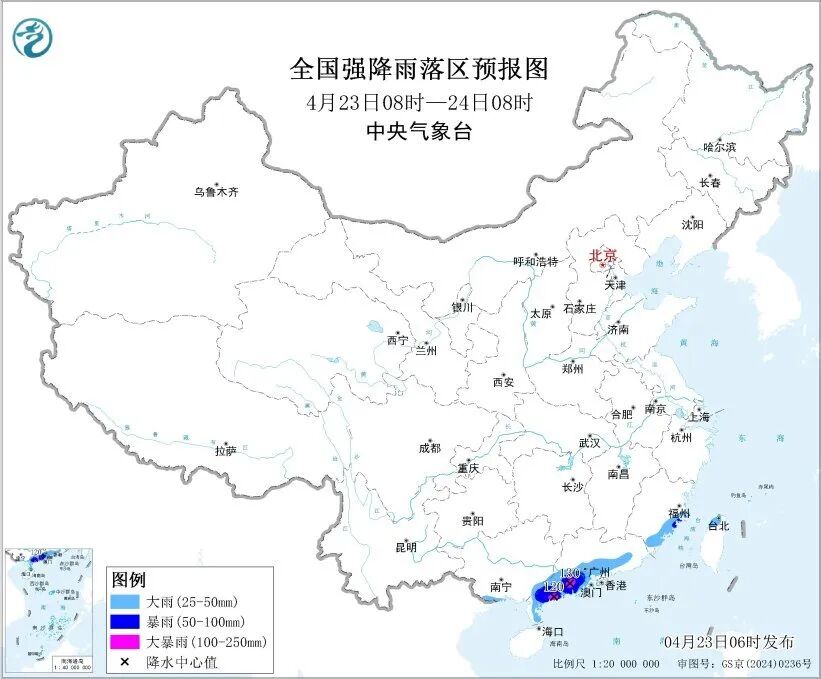 中央气象台4月23日6时继续发布暴雨蓝色预警:预计,4月23日8时至24日8时,广西东南部、广东南部、福建东南部等地部分地区有大到暴雨,其中,广东西南部等地部分地区有大暴雨(100~130毫米)。上述部分地区伴有短时强降水(最大小时降雨量20~40毫米,局地可超过50毫米),局地有雷暴大风等强对流天气。
