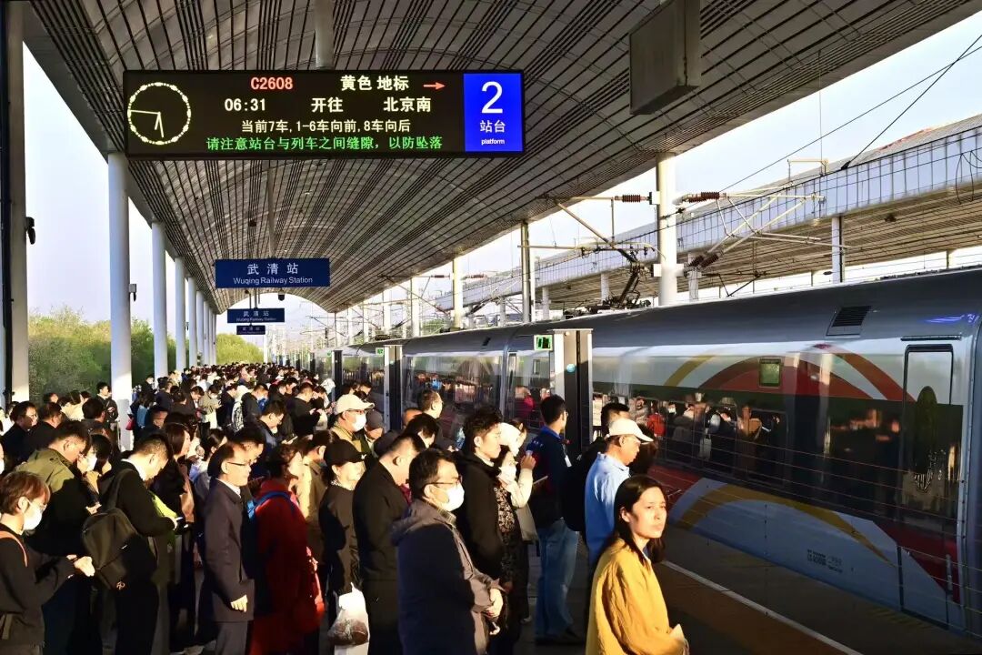 昨日清晨,武清站站台上的乘客准备登车。记者 张磊 摄