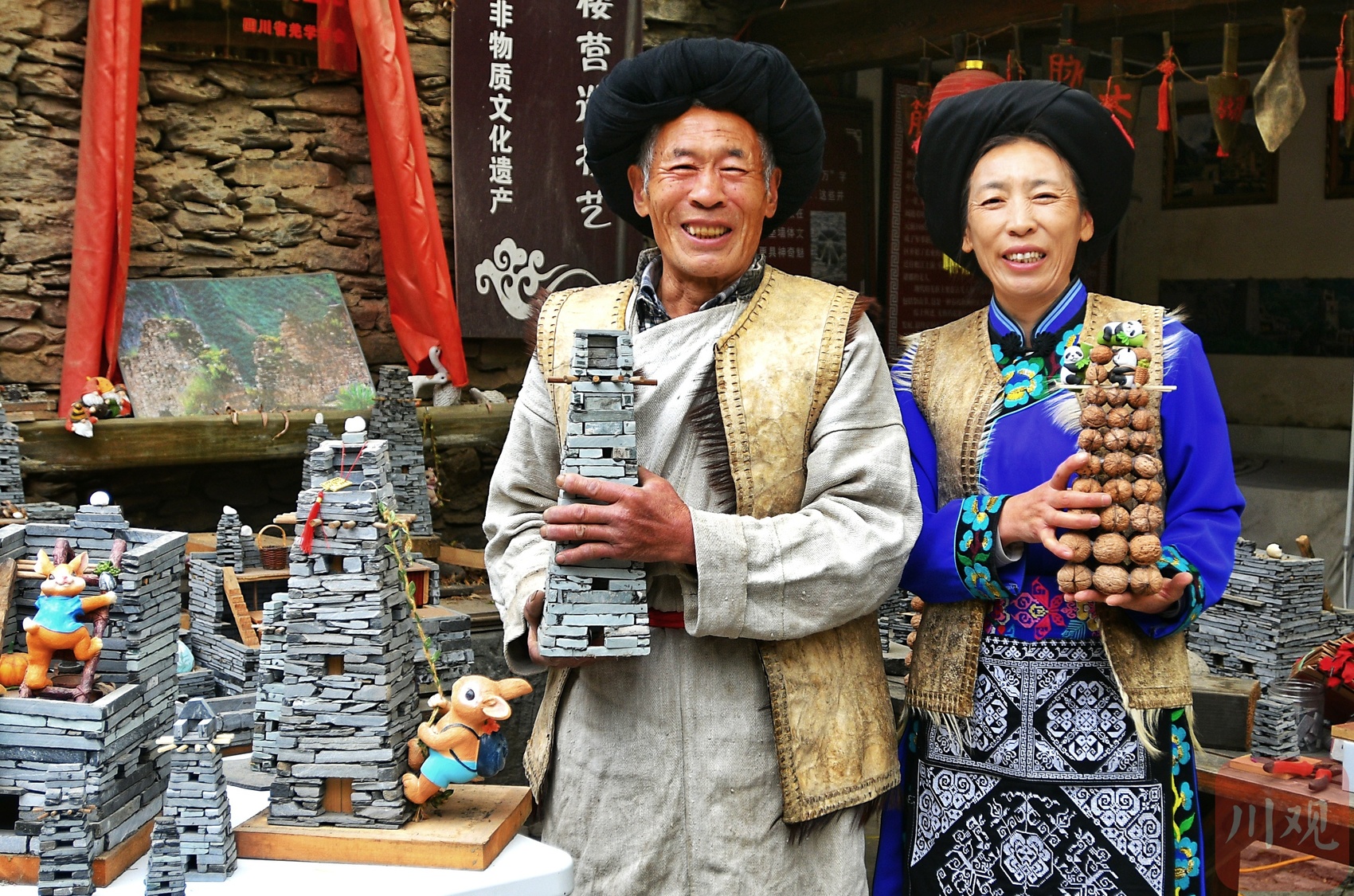 碉楼营造技艺传承人贾学友父女。