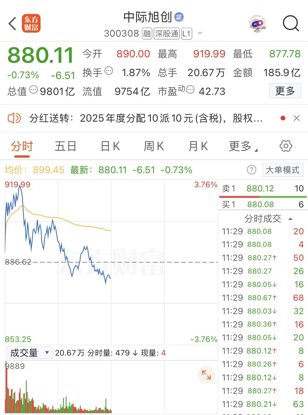 4月23日,全球光模块行业龙头中际旭创开盘后股价直线拉升,早盘最高触及919.99元/股,距920元整数关口仅一步之遥;短暂冲高后,部分投资者因“恐高情绪”获利了结,股价快速回落至890元/股支撑位,随后持续震荡。截至午间收盘,股价稳定在880.11元/股,总市值9801亿元。
