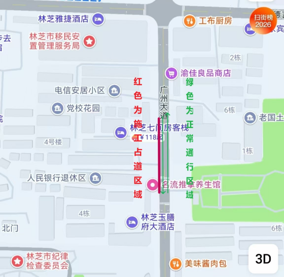 因林芝市巴宜区老旧小区改造项目施工需要,同时保障过往行人、车辆通行安全,现决定对广州大道段(人民银行小区)门口路面实施单边半封闭交通管制,现将有关施工安排公告如下: