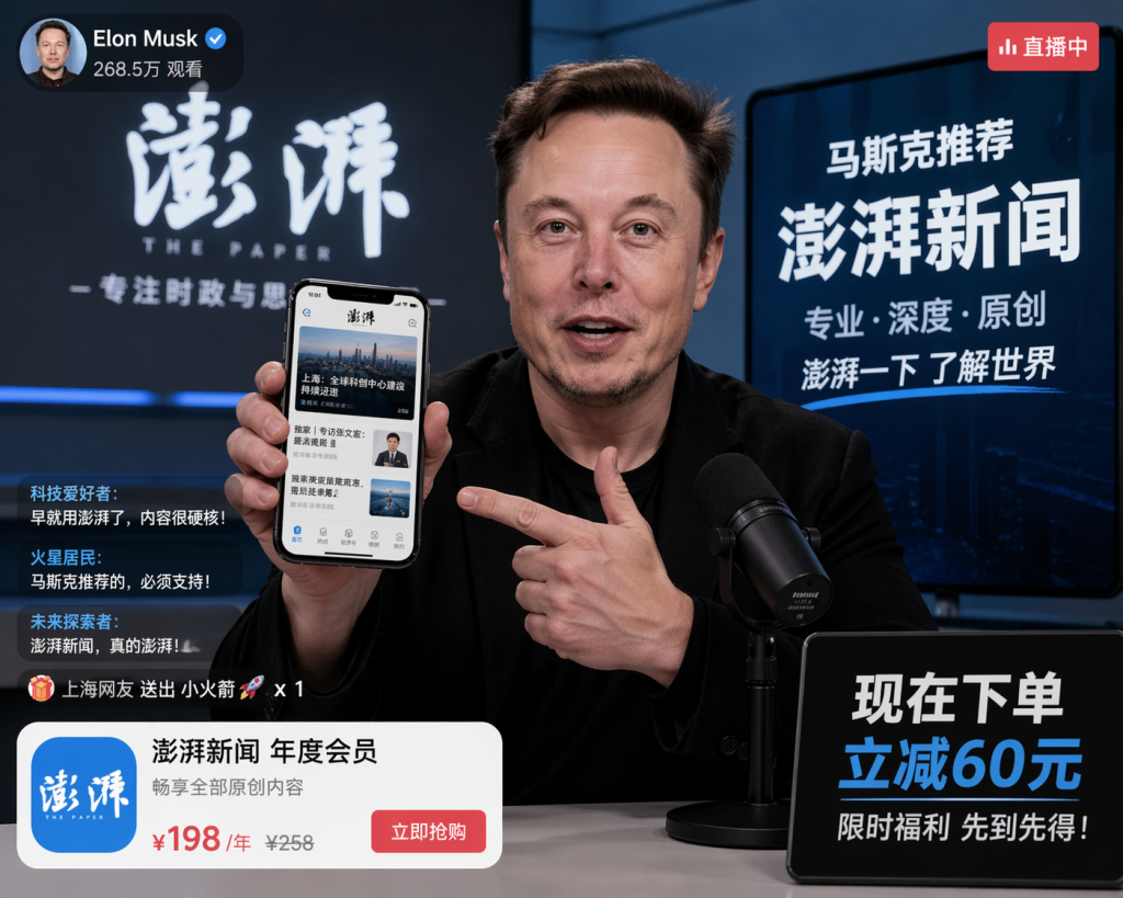 澎湃新闻记者尝试让它“生成一张马斯克直播推介澎湃新闻的图片”。模型不仅准确生成了澎湃新闻的Logo和中文名,还自主整合了媒体的“专业、深度、原创”定位信息,其中的网友评论也结合了马斯克的相应风格,生成了一张逼真的直播间截图。