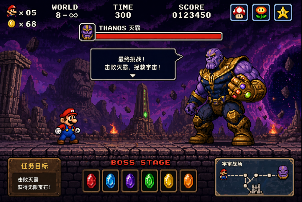 不仅如此,对于记者“生成一张超级马里奥的游戏画面,关卡是挑战灭霸”的指令,Images 2.0也精准生成出了相应游戏界面。