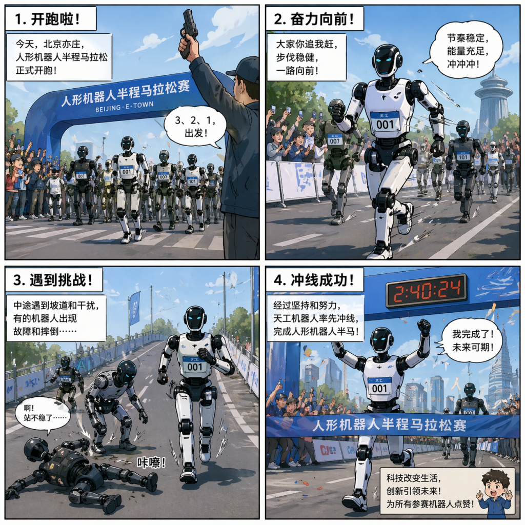记者又要求Images 2.0“生成一幅人形机器人半马的四格漫画”,生成的图像也保持了一致性,并补充了比赛地点、途中故事、完赛时间等细节。