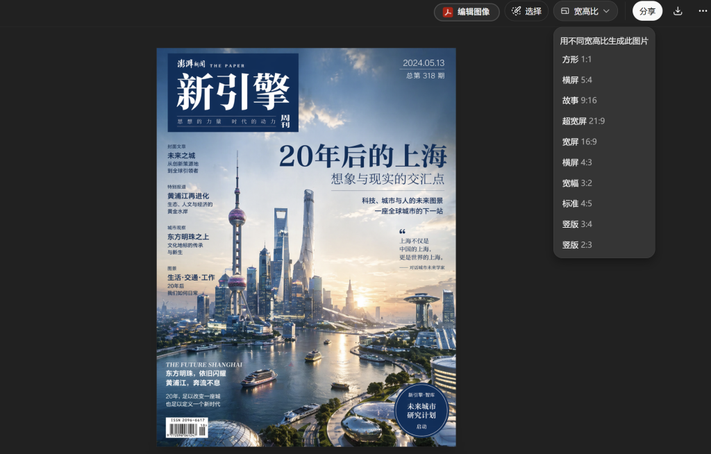 记者又要求模型生成一张澎湃新闻《新引擎》周刊封面,主题为“20年后的上海”,并包含“东方明珠”、“黄浦江”等中文字样。Images 2一次性成功生成了排版清晰、文字准确的封面图,无论是大标题还是小字注释,都没有出现以往模型常见的笔画扭曲或乱码问题。