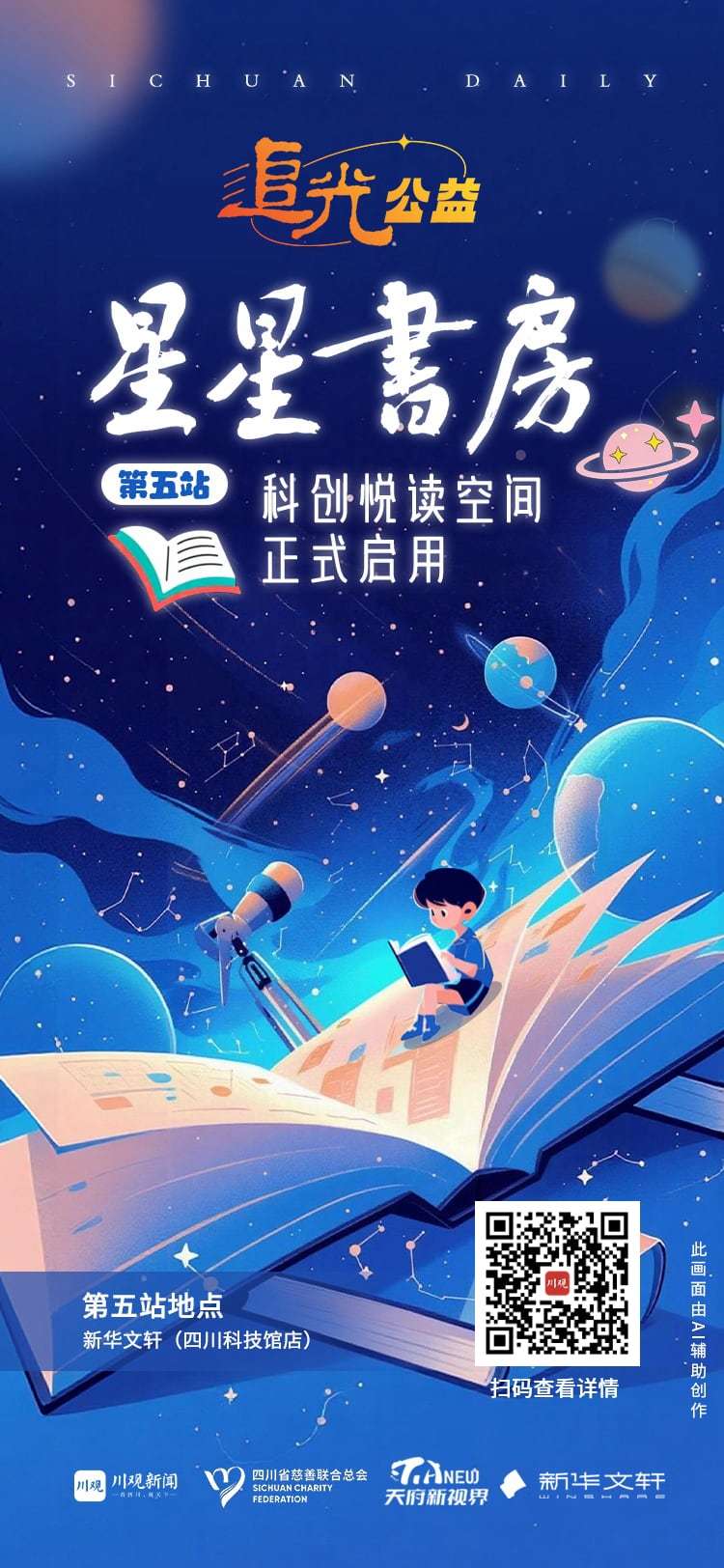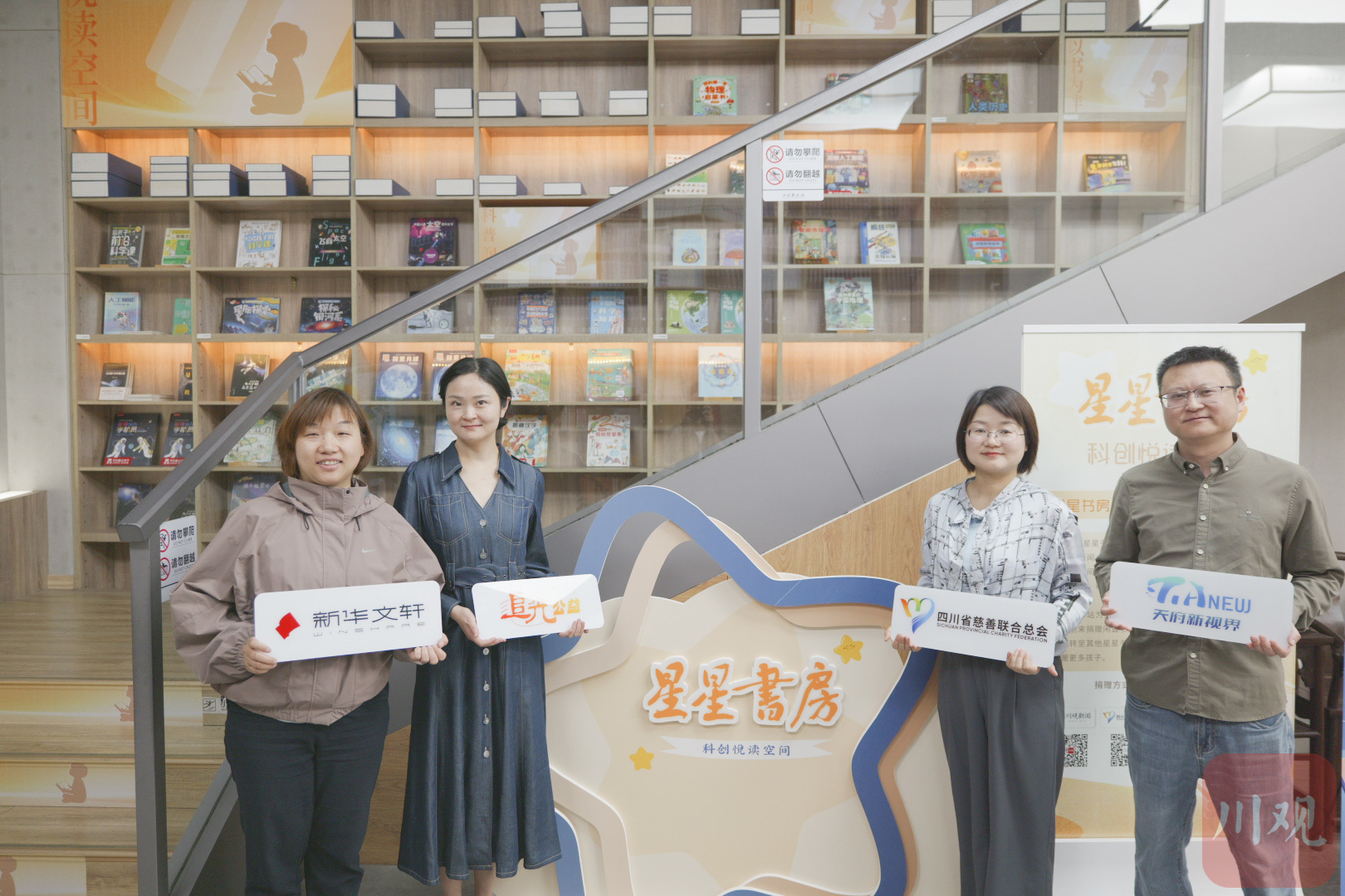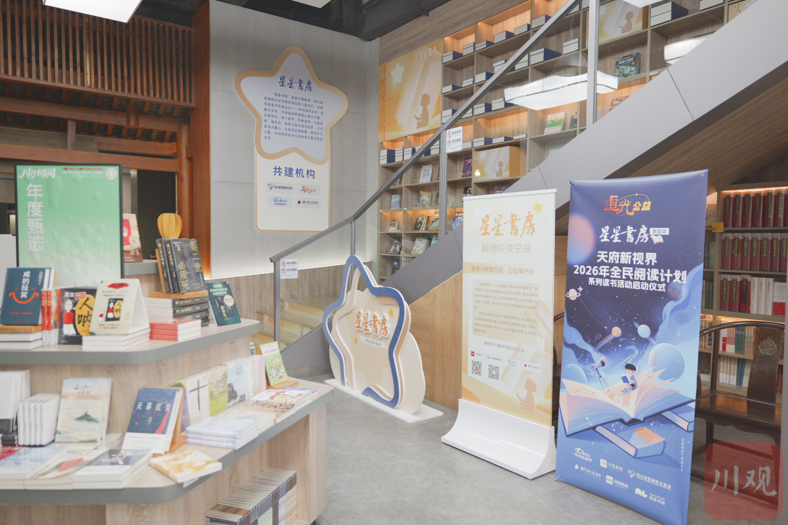 第五站星星书房由川观新闻、四川省慈善联合总会、天府新视界、新华文轩同心共建,四方携手以“阅读+科普”全新模式,将公益阅读从“疗愈陪伴”升级为“科创启蒙”,同步打造项目首个常态化线下公益捐书固定点位,为广大爱心市民提供便捷、透明、可直达的捐书通道,以书香力量点亮孩子的科技探索之路。
