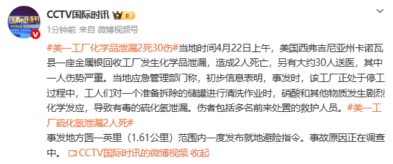 据@CCTV国际时讯消息,当地时间4月22日上午,美国西弗吉尼亚州卡诺瓦县一座金属银回收工厂发生化学品泄漏,造成2人死亡,另有大约30人送医,其中一人伤势严重。当地应急管理部门称,初步信息表明,事发时,该工厂正处于停工过程中,工人们对一个准备拆除的储罐进行清洗作业时,硝酸和其他物质发生剧烈化学反应,导致有毒的硫化氢泄漏。伤者包括多名前来处置的救护人员。