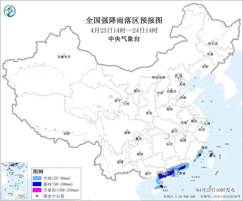 预计,4月23日14时至24日14时,广东南部、海南岛北部、福建东南部、台湾岛西北部等地部分地区有大到暴雨,其中,广东西南部局地有大暴雨(100至130毫米);上述部分地区伴有短时强降水(最大小时降雨量20至40毫米,局地可超过50毫米),局地有雷暴大风等强对流天气。