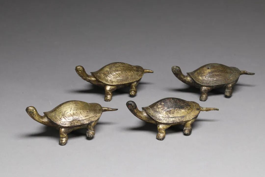 4只鎏金铜龟则个个昂首前爬,背壳上錾刻回字纹与介字纹。刘思哲解释,古人认为龟寿千年,其“龟息”之法更是传说中的长生之道,墓中放置铜龟,既寄托了对死后长寿的期盼,也因唐代五品以上官员佩“龟袋”的习俗,彰显了墓主人的身份地位。
