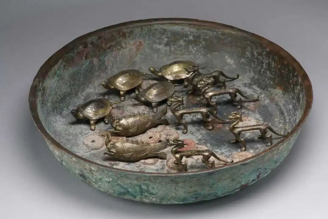 据介绍,这座大型唐墓位于西安东郊,1998年发掘。考古人员当时在清理棺床下方的腰坑时发现了一套罕见的遗物组合。该组合放置于铜盆之中,仿佛一个“动物园”:包含5条鎏金铜走龙、4只鎏金铜龟、2条鎏金铜摩羯鱼及16枚开元通宝。另外,墓室角落还出土铁牛2件。