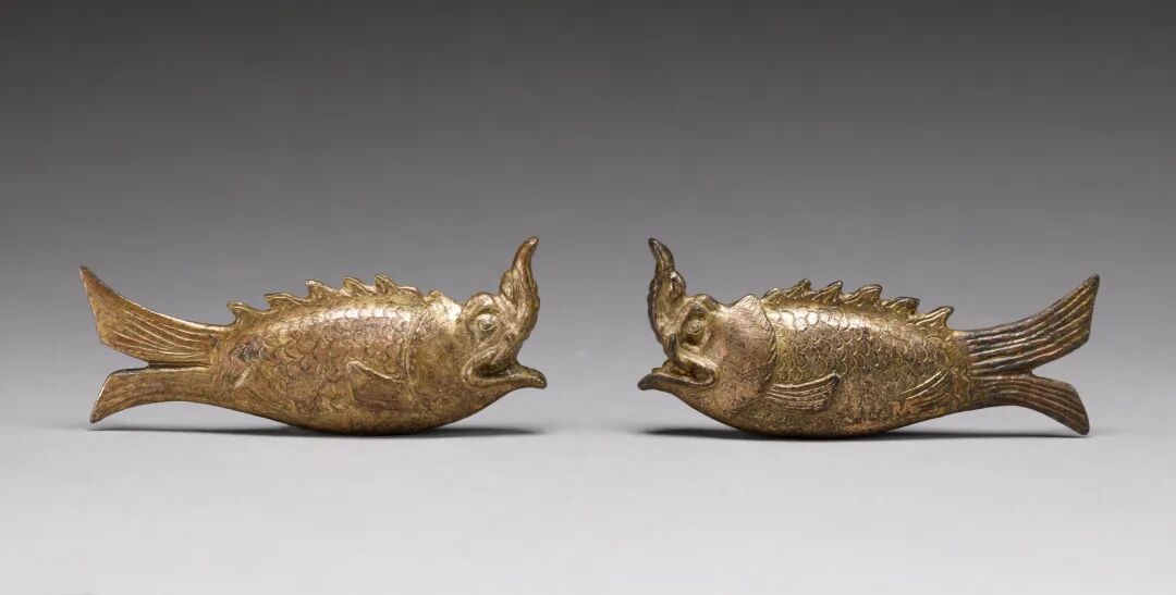 2条鎏金铜摩羯鱼最具特色,带有鲜明的印度—中亚艺术风格,其造型为龙头鱼身,本是印度水神的坐骑,随着佛教传入中国后,逐渐演变为“鱼化龙”的吉祥形象,成为中外文化交流的直接实物见证。
